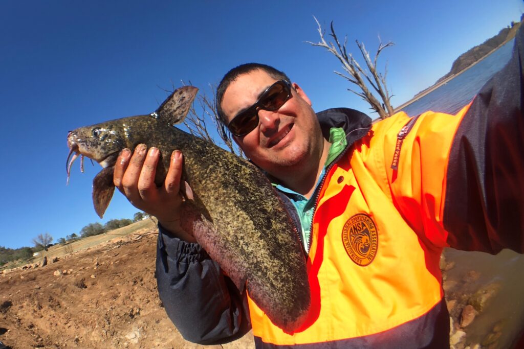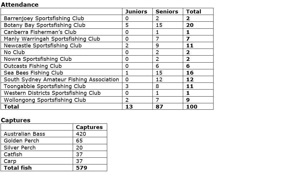 Everyone agreed at the BBQ that fishing was a little tough. Despite the strong winds, some anglers did well, like junior angler Hamish Stolk from Wollongong Sportsfishing Club. He landed some monster Carp and Catfish off the bank. Others travelled upstream of the dam to find Bass in warmer waters.