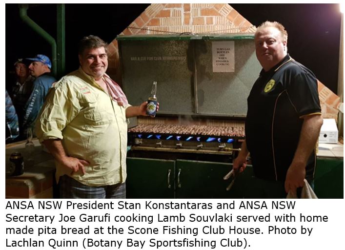 Stan Konstantaras and Joe Garufi hosted a BBQ dinner at the Scone Fishing Club House. Dinner was Lamb Souvlaki and home-made pita bread. It was a very tasty dinner and it was a great opportunity to catch up with familiar faces like Fay and Ron Hanson from Nowra, Chris Stolk from Wollongong, and Barry Mainsbridge and Jenny from Sea Bees Fishing Club as well as making new acquaintances like Eddie Sitarz from Newcastle Sportsfishing Club.